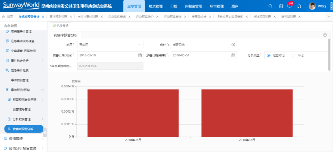 应急事件管理和应急现场流调管理,可实现疫情信息的迅速采集,并在此基础上,统计分析疫情,结合数据信息和传染病的传播机理,开展疫情趋势预测、进行疫情预警与管控分析,从而为公众、政府提供准确的疾病传播预警。