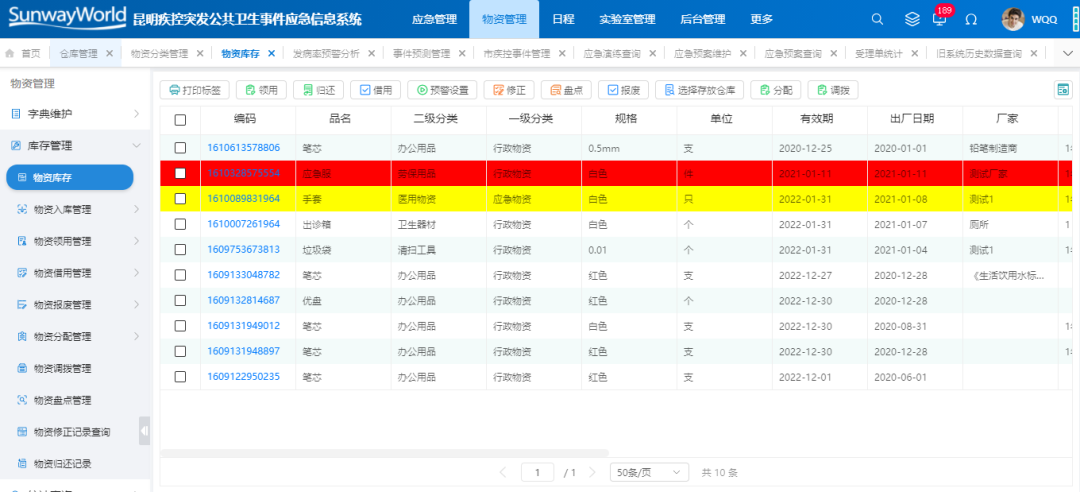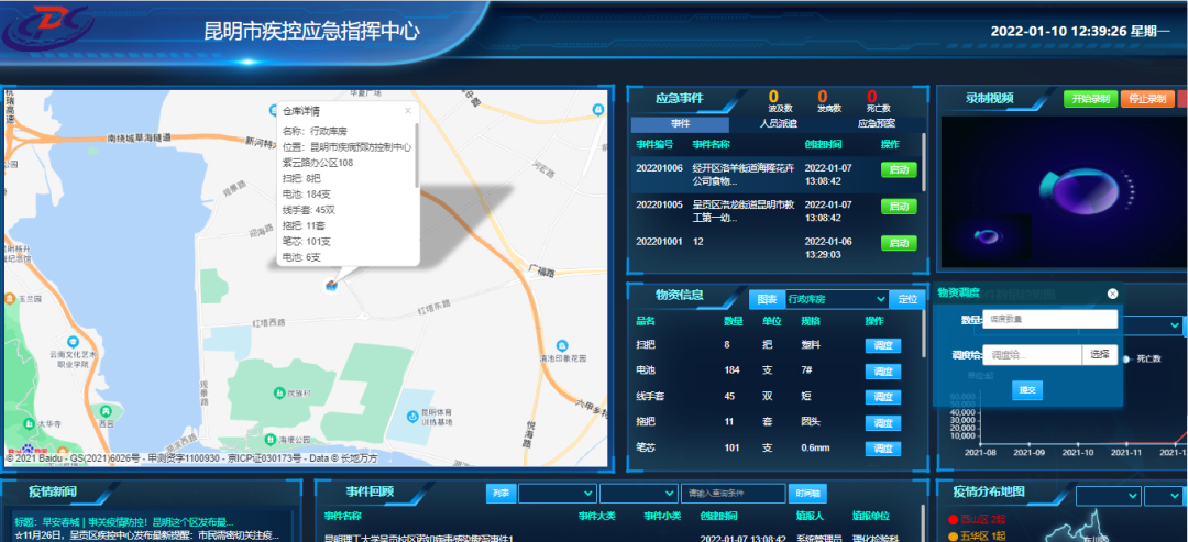 主要实现对应急物资和行政物资的管理。同时通过与地图的结合,通过GPS定位实时查看与疫情发生地附近仓库及物资存储情况,实现在线应急物资调度管理。