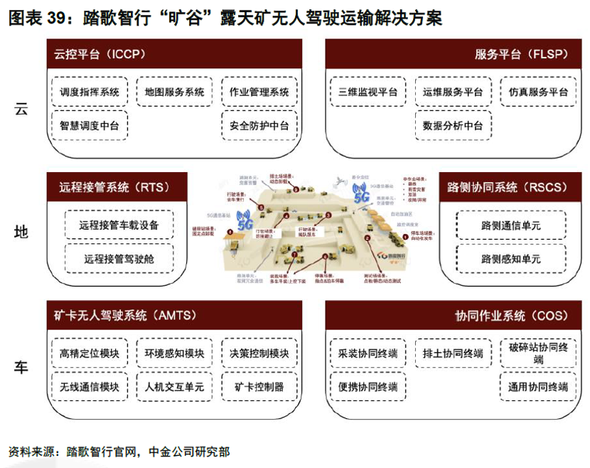 就技术趋势而言,中金研报提到,由于作业流程复杂,系统智能下的“车地云协同”成为必要条件,自动驾驶在矿区更是多维度技术的综合应用。无人驾驶矿车底盘线控技术是无人驾驶实施的关键点之一,系统架构标准化、模块化设计将成为主流,OTA技术也是行业关注的方向,大数据技术成为企业后续拓展市场的重点。