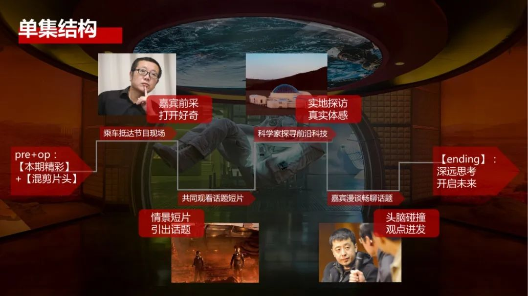 从眼前出发,关注当今现实生活中的民生点滴和时事热点;去前沿探访,科学家每期探访具有未来属性的地点,或是研究院、或是未来体验馆;向百年幻想,MC将在节目中邀请十余位来自各个领域的专家以更加科学、更加理论的角度畅聊未来。