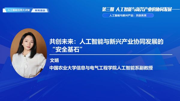 人工智能应用大讲堂系列活动:中国 农业大学信息与电气工程学院人工智能系副教授文娟——《共创未来:人工智能与新 兴产业协同发展的“安全基石”